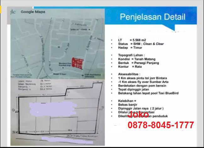 Luas Tanah: 5,568 M2DIJUAL CEPATTanah Komersial Jl. Bintara Jaya, Pondok Kelapa, Duren Sawit, Jakarta TimurSpesifikasi:- Luas Tanah : 5.568 M2- SHM - Lebar: 48 Meter- Hadap Timur- Bebas Banjir- Lokasi jalan rayaBISA DIBELI 1.400 meter atau 2.800 MeterLokasi Istimewa:- Dekat Apartemen Kelapa Vilage & Aparteman Nuansa Pondok Kelapa- Dekat Pintu Tol Bintara- Dekat Rumah Sakit islam pondok kopi- Dekat Giant Pondok kopi- Dekat Stasiun Cakung dan Stasiun Pondok kopiCocok Untuk:- Gedung Perkantoran- Hotel / Rumah Kost Mewah- Rumah sakit- Sekolah- SPBU- Pusat perbelanjaan / Mini Market- Hunian- Pool taxi, Pool Truck atau Pool Bus# Harga : 12 Juta / m2 atau # Harga Total: 66,8 Milyard (Masih Nego)More Info:Joko0878-8045-1777Terima titip Jual, Beli dan Sewa Properti#tanahbaru #tanahterlaris #tanahterbaru #tanahdijual #tanahjakartatimur #tanahdurensawit #tanahpondokkelapa