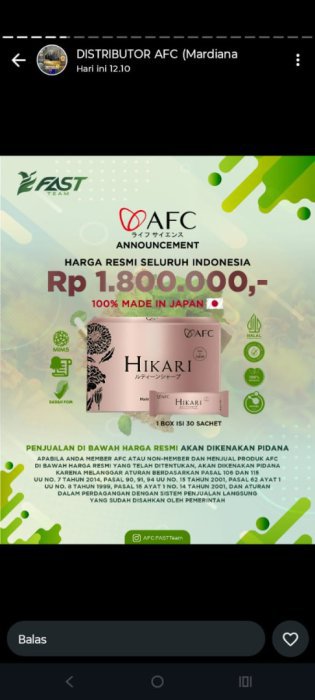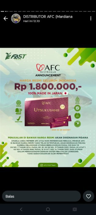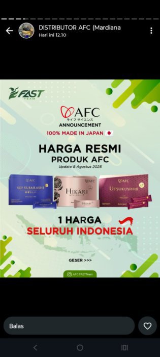 SOP SUBARASHI merupakan produk Triple Peptide PERTAMA di Jepang yang memiliki bahan utama yaitu Marine Placenta ikan Oncorhyncus Keta Salmon di Hokkaido, Sardine Peptide dan Fruitflow (Vegan peptide). Diolah dan diproses dengan teknologi terkini dari Jepang sehingga menghasilkan peptide nano size 600 Dalton, sehingga mudah untuk diserap dan berfungsi maksimal dalam tubuh manusiaBerdiri sejak tahun 1969, AFC Japan adalahPERUSAHAAN PHARMACY salah satu yang tertua dan terbesar di Jepang- Perusahaan farmasi pertama yang terdaftar di TOKYO STOCK EXCHANGE- Pabrik farmasi Jepang pertama yang mendapatkan sertifikat GMP- Perusahaan AFC yang sudah GO-PUBLIC telah hadir di Indonesia. Terdaftar di AP2LI Menjadi perusahaan Direct Selling terbesar dan terpercaya di Indonesia.PRODUKSOP SUBARASHISOP SUBARASHI merupakan produk Triple Peptide PERTAMA di Jepang yang memiliki bahan utama yaitu Marine Placenta ikan Oncorhyncus Keta Salmon di Hokkaido, Sardine Peptide dan Fruitflow (Vegan peptide). Diolah dan diproses dengan teknologi terkini dari Jepang sehingga menghasilkan peptide nano size 600 Dalton, sehingga mudah untuk diserap dan berfungsi maksimal dalam tubuh manusia. MANFAAT PRODUKYANG DIRASAKAN PARA KONSUMEN Manfaat produk yang dirasakan para konsumen:Memperbaiki sel yang sudah rusakMengaktifkan kembali sel yang tertidurMeregenerasi sel yang butuh pembaharuanMembantu mengatasi masalah yang berkaitan dengan StrokeMembantu mengatasi masalah yang berkaitan dengan JantungMembantu mengatasi masalah yang berkaitan dengan Pembuluh darahMembantu mengatasi masalah yang berkaitan dengan Tekanan darahMembantu mengatasi masalah yang berkaitan dengan GinjalMembantu mengatasi masalah yang berkaitan dengan PankreasMembantu mengatasi masalah yang berkaitan dengan AsmaMembantu mencegah pembekuan darahMembantu menurunkan tekanan darah tinggiMembantu mencegah keluarnya albumin pada pasien gagal ginjalMembantu menjaga kestabilan hormonMembantu meningkatkan jumlah dan kualitas ASIMembantu mengatasi masalah yang berkaitan dengan sendiMembantu mengatasi masalah yang berkaitan dengan kerutan (Keriput)Membantu memperbaiki toleransi tubuh pada glukosaMinat hub +62 877-8165-4080